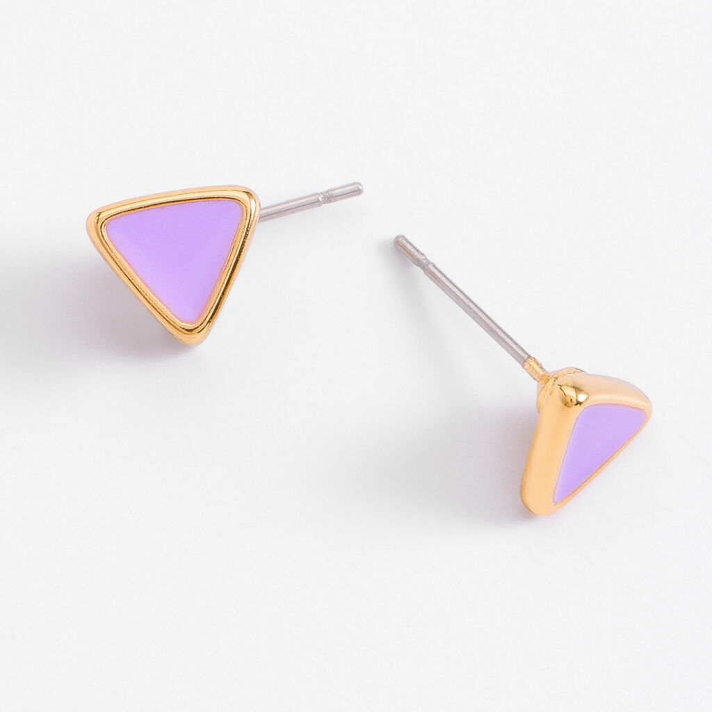 Hermosos aretes para las más pequeñas del hogar en forma triangular, en baño de oro con esmalte color lila.