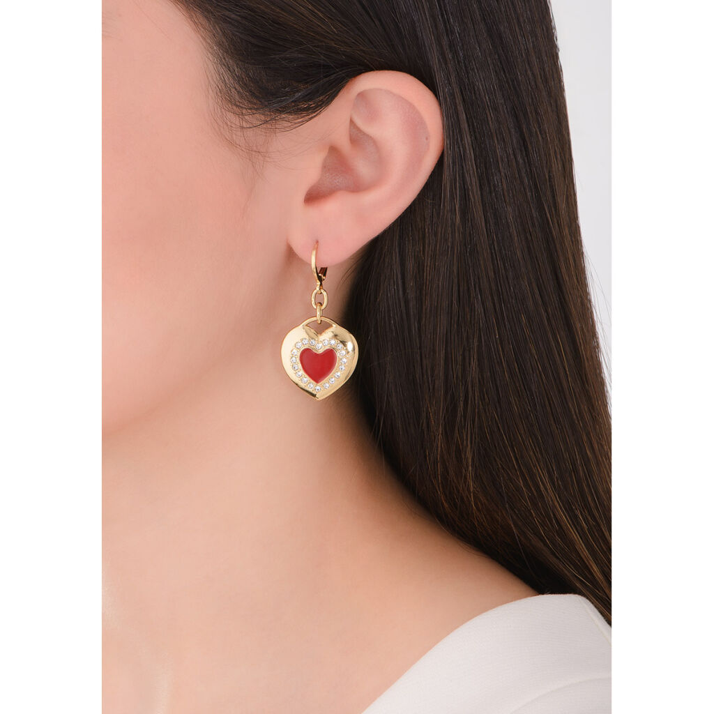 Cautivadores aretes en forma de corazón, decorados con un baño dorado y piedras en tono cristal esmaltado en rojo, simbolizando el amor eterno que arde en tu corazón. - Aretes con patente - Baño de Oro de 18K - Piedras en tono cristal - Esmalte en tono rojo